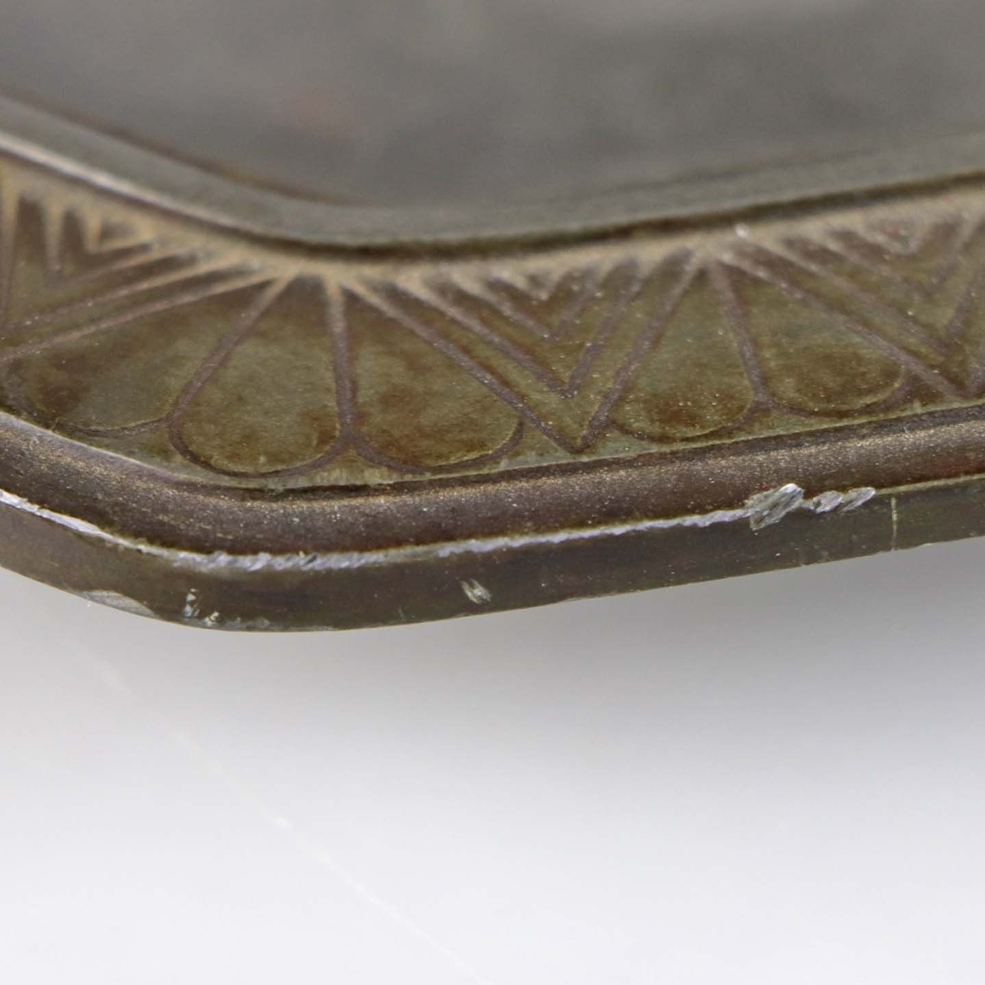 Disko metal fad. Midt i fadet sidder en figur af en kvinde med en fugl