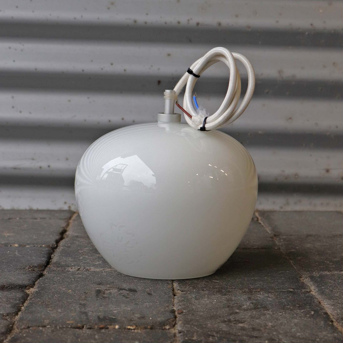 Pendel i hvidt mundblæst glas med blomstermotiver og porcelænsfatning