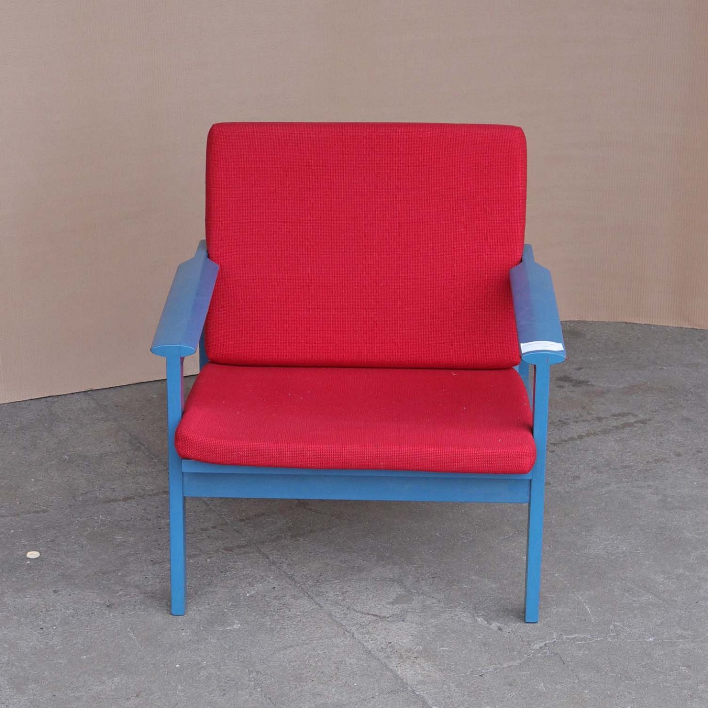 Lænestol med stel i blålakeret teaktræ og hynder betrukket med rødt uldstof, model Capella