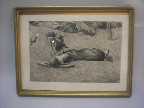 Beskrivelse: Grafik: Louis Moe Faun og Kentaur Opus IV Kentauren er halvt menneske og halv hest. Lysmål 29 x 19 cm. I gammel sølvramme 28 x 37 cm SIgneret Louis Moe Opus IV 1900