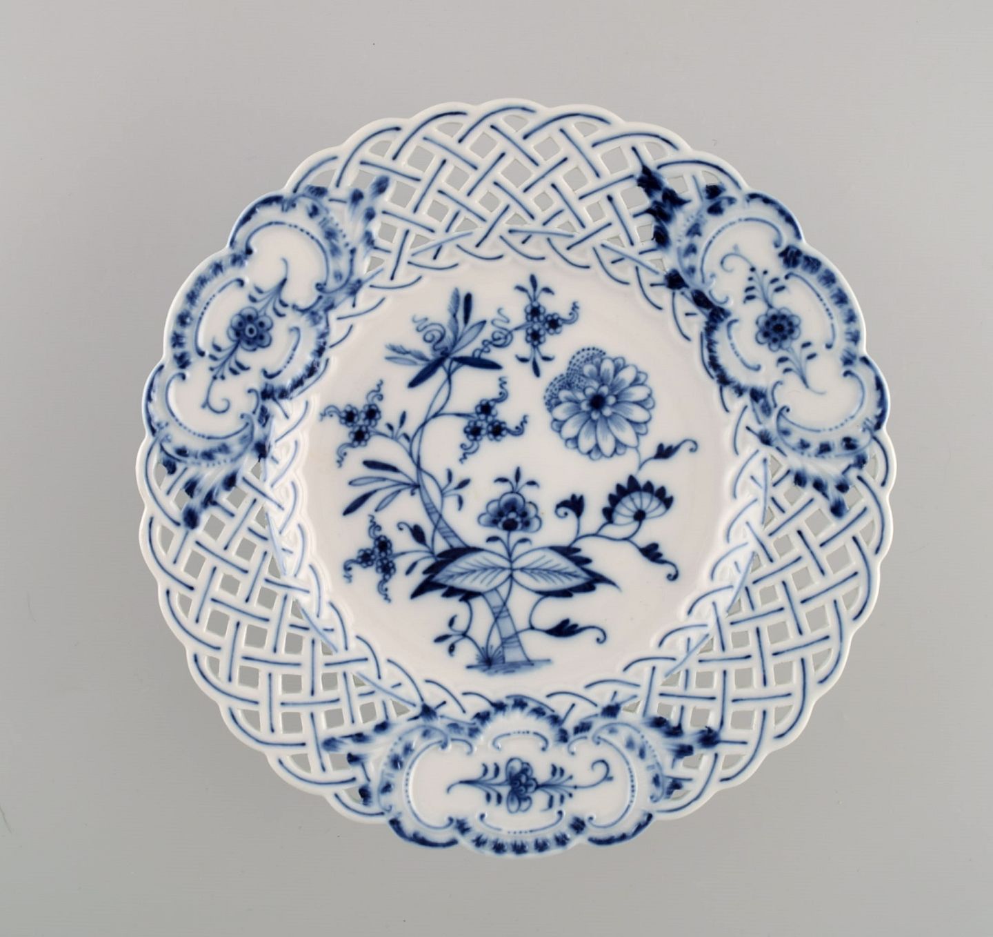 Meissen Blue Onion compote in openwork porcelain. Early 20th century. Measures: 20.5 x 6.8 cm. In excellent condition. Stamped. 1st factory quality.