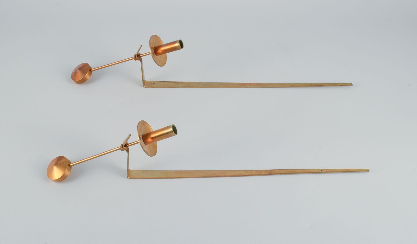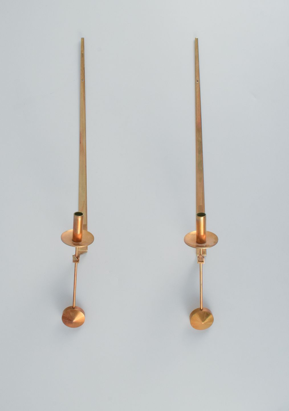 Skultuna, Sweden, a pair of brass candlesticks for wall hanging. Designed by Pierre Forsell. Marked. In excellent condition. Total length 48.5 cm.