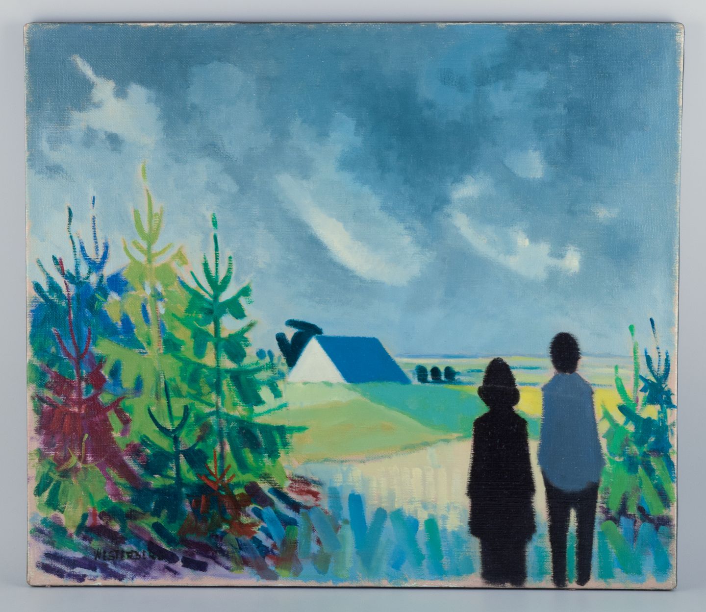K. Westerberg, also known as Knud Horup, listed Danish artist, oil on canvas. Modernist style. Landscape with figures.