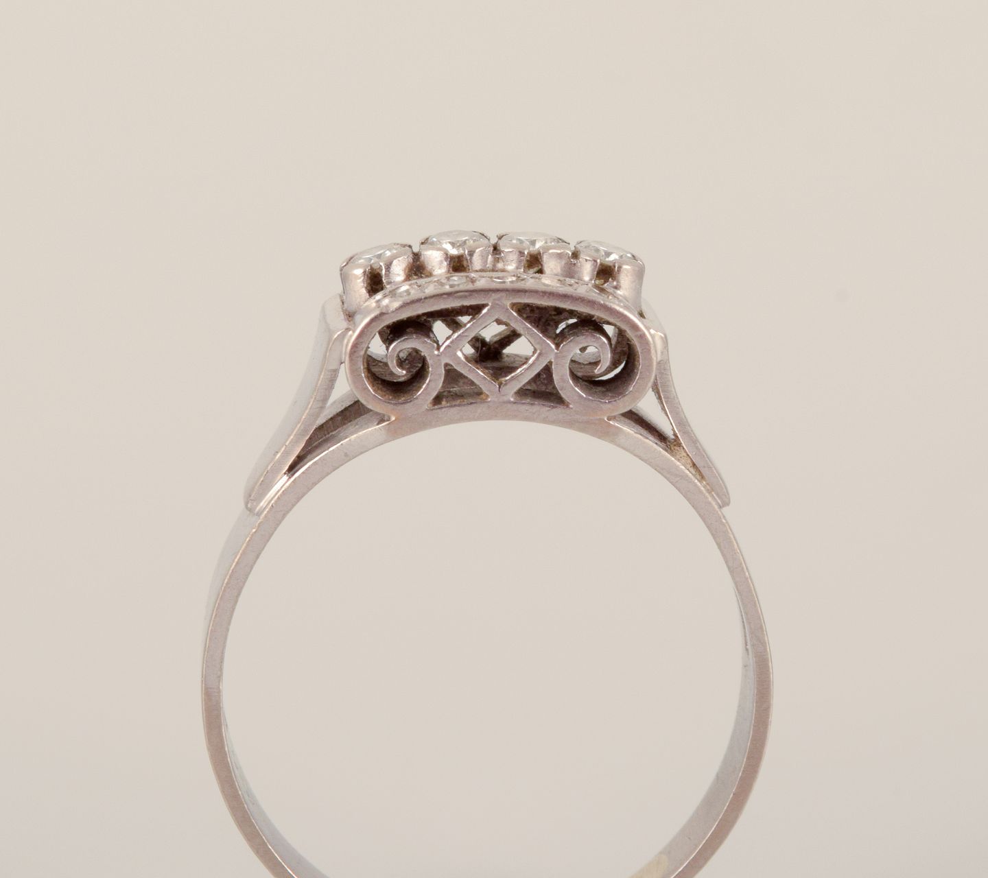 Swedish vintage 18 karat diamond ring in white gold adorned with four large diamonds and ten small diamonds. Classic Art Deco style. Gothenburg goldsmith.