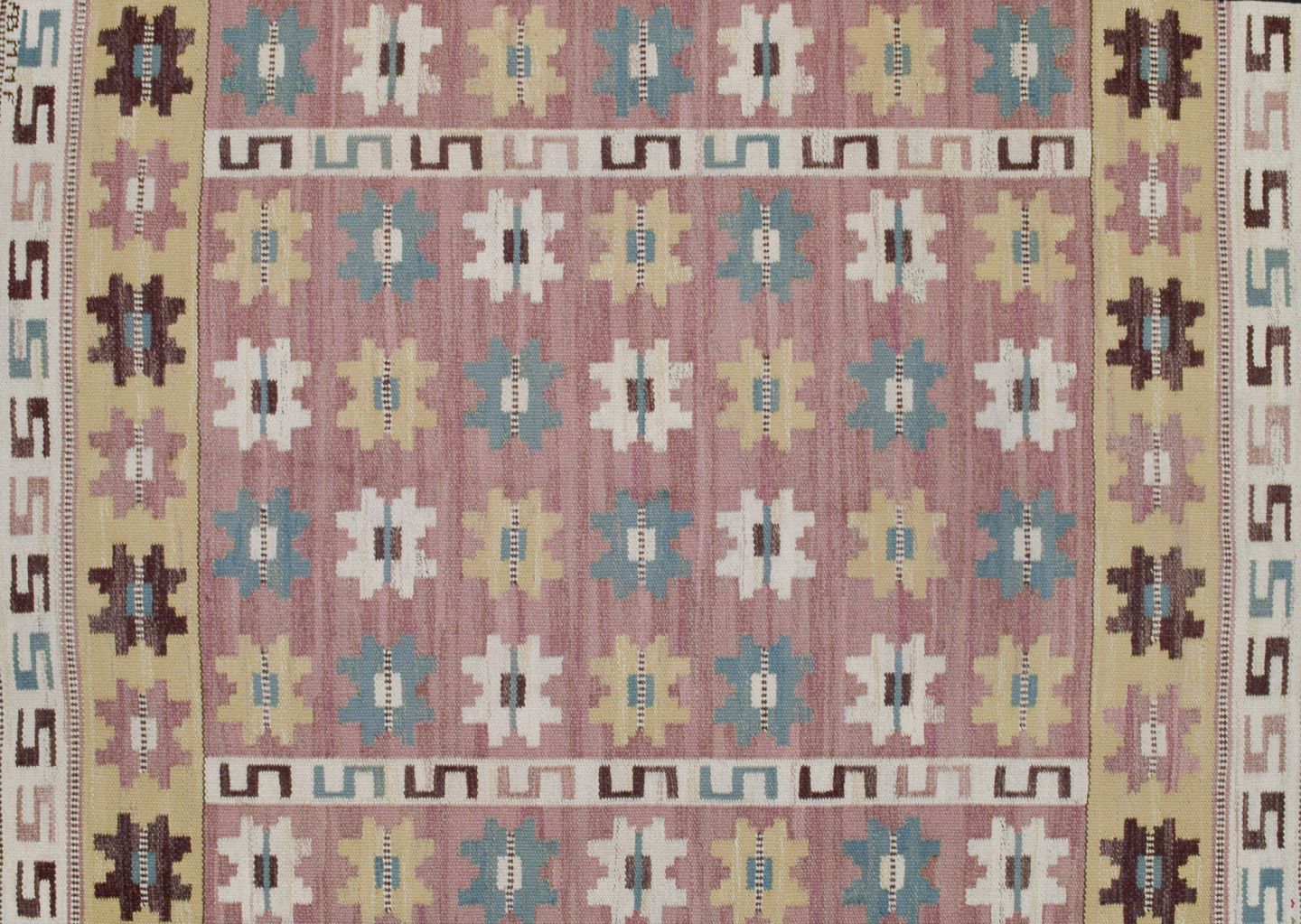 “Sipporna” (The Anemones). Handwoven unique wool carpet in "rölakan" technique with polychrome geometric pattern.