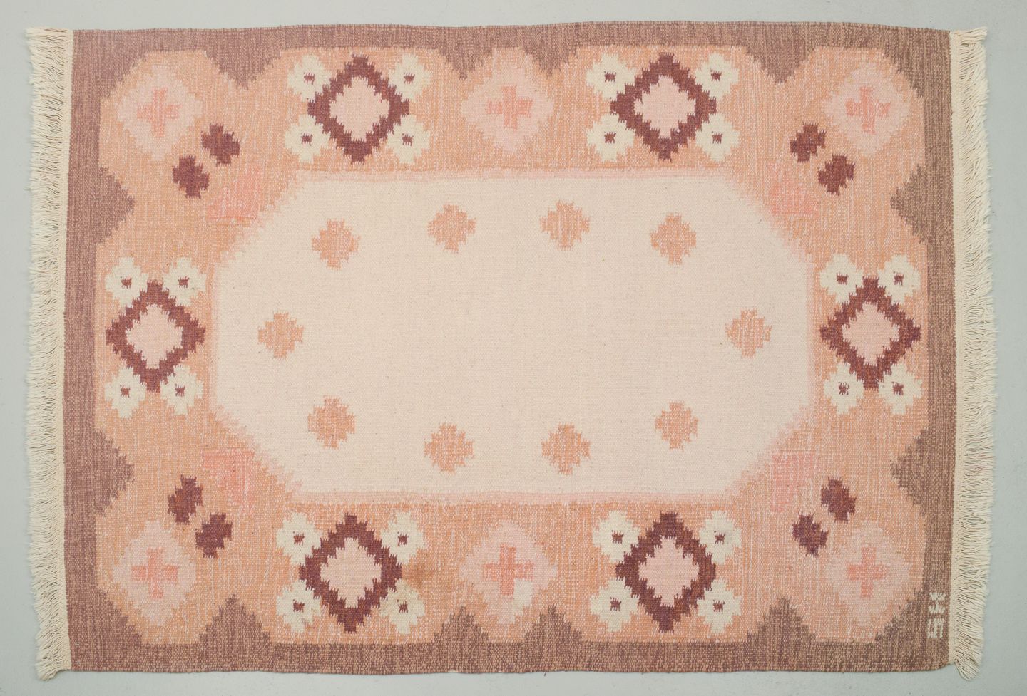 Swedish handwoven carpet in pure wool. Rölakan technique. Geometric pattern in white, brown, and light brown colors.
