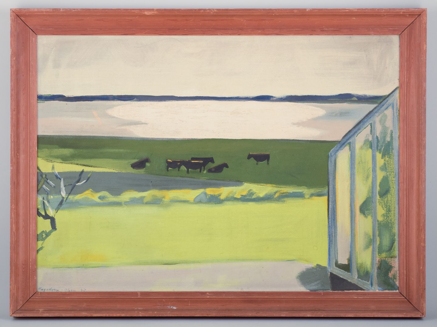 Modernist Danish landscape with grazing cattle and a fjord.