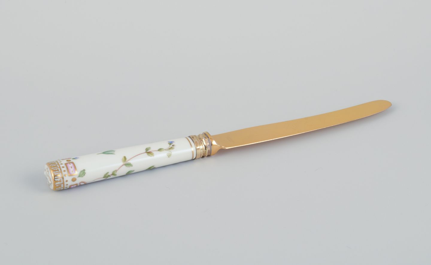 Royal Copenhagen Flora Danica/Georg Jensen. Dinner knife, hand-painted with Flora Danica motif. Blade by Georg Jensen in gilt sterling silver.