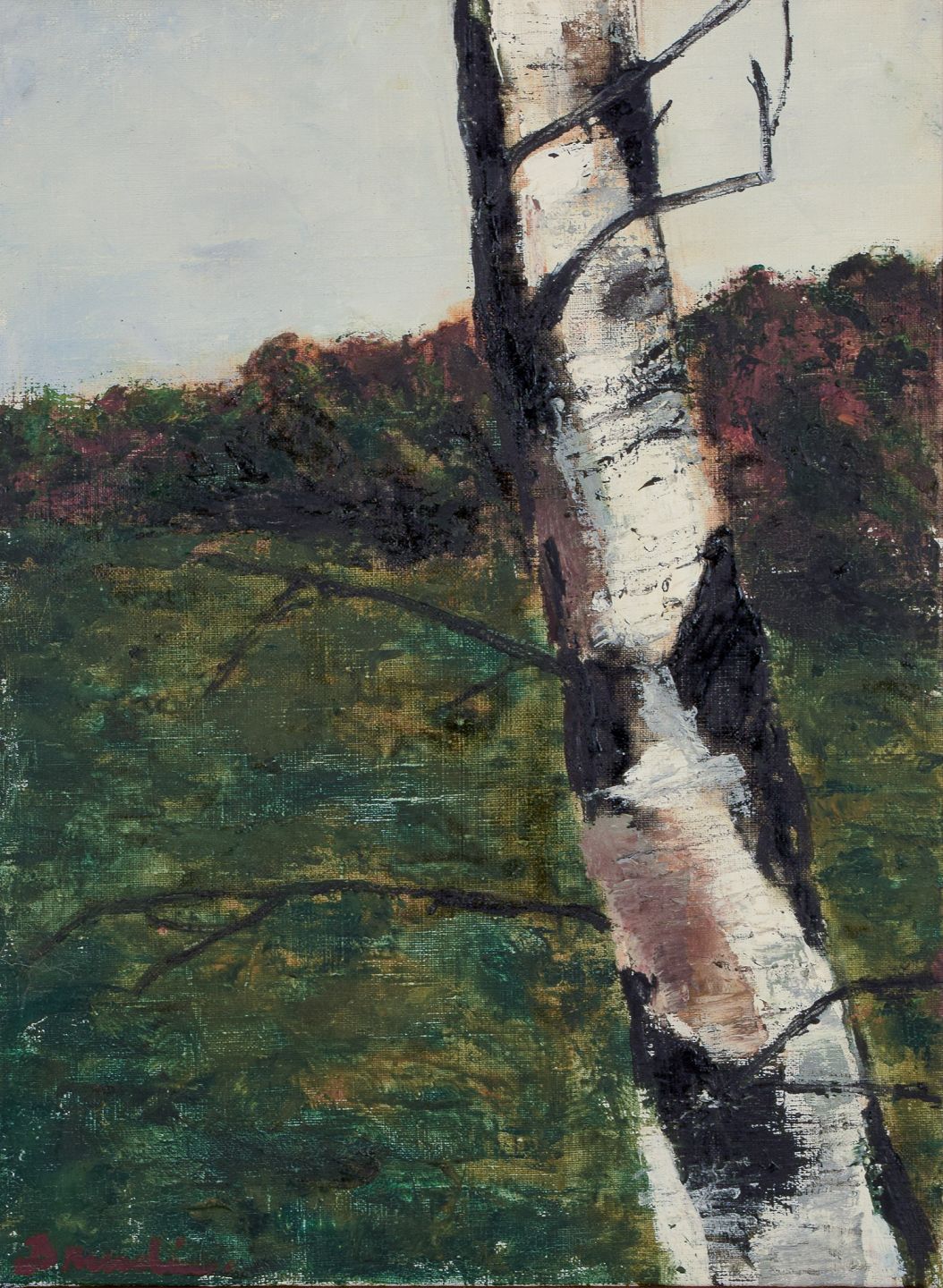 Hanna Brundin (1914-2000), Swedish artist. Oil on canvas. Landscape with birch tree in the foreground.