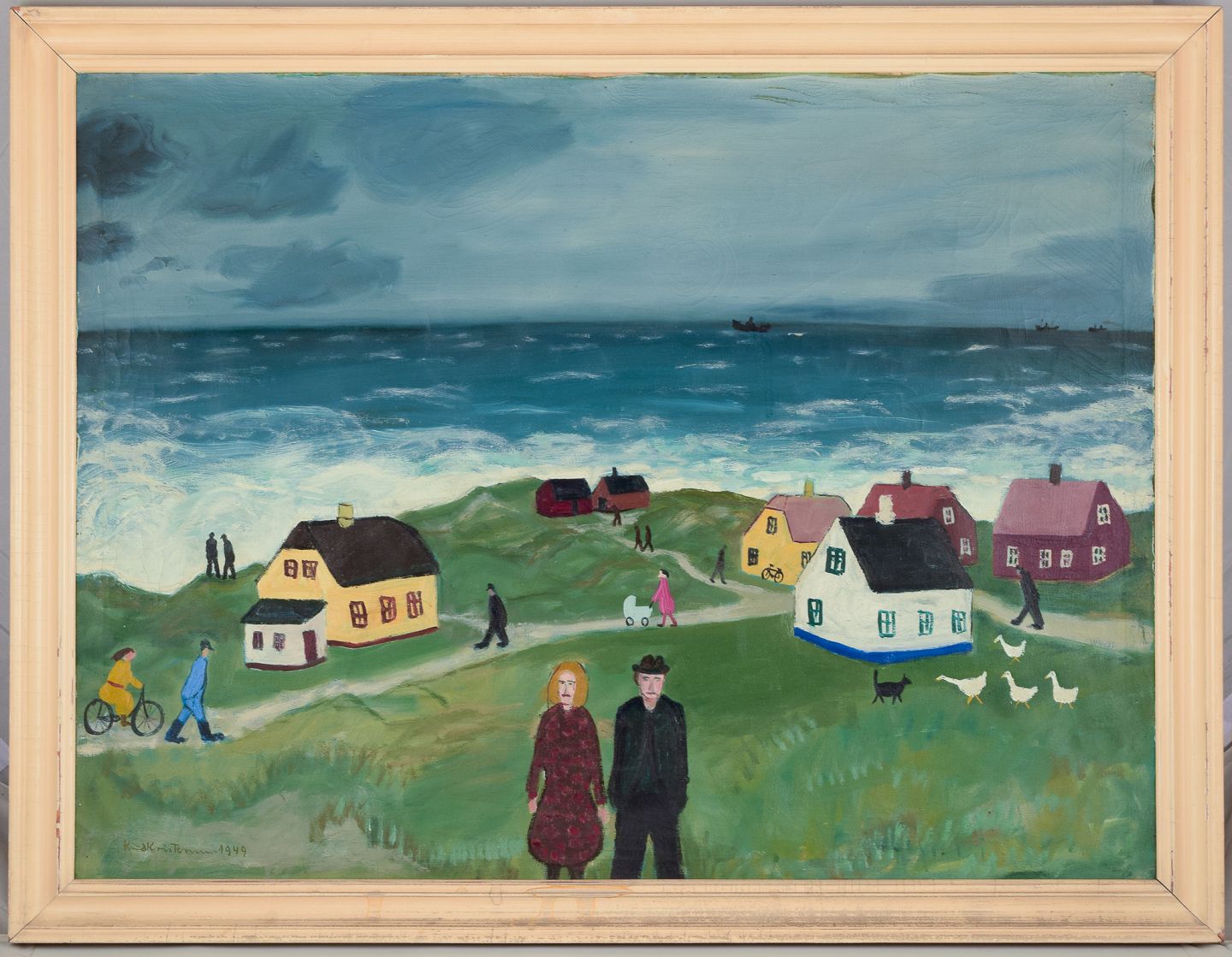 Knud Kristensen (1915-1991), oil on canvas. Naive landscape from Hanstholm, North Sea. Signed and dated 1949. In fine condition, some craquelure. Dimensions: 96 cm x 72 cm. Total dimensions: 106 cm x 82 cm.