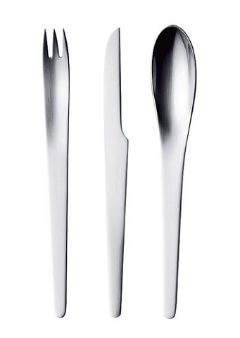 AJ-bestik af Arne Jacobsen, 1957. Bestikket blev udviklet i til SAS Royal Hotel i København og blev i begyndelsen brugt i hotellets restaurant. Gæsterne kunne imidlertid ikke vænne sig til den specielle udformning, og AJ-bestikket blev hurtigt udskiftet med et mere konventionelt design. Georg Jensen.
