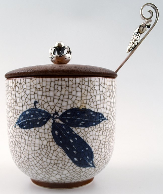 B&G, Bing & Grondahl Art Deco jam jar in craquelé with lid in teak, silver knob and a silver spoon. 1930/40s. Marked. In good condition. Measures 8 x 10 cm.