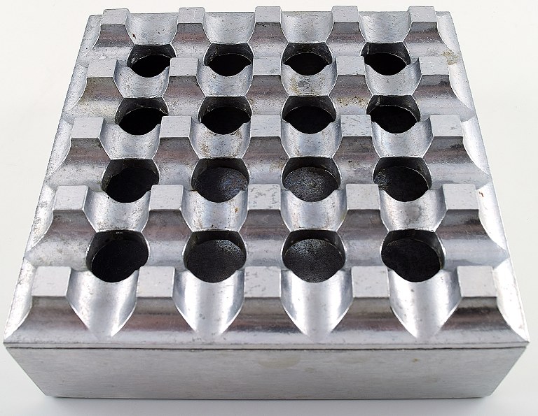 ULTIMA 15 ASHTRAY BY HOLGER BÄCKSTRÖM AND BO LJUNGBERG FOR AKVAMATIK AB, TRANAS, SWEDEN. SWEDISH DESIGN. Polished Aluminium. In good vintage condition W 15cm, L 15cm, H 5 cm.