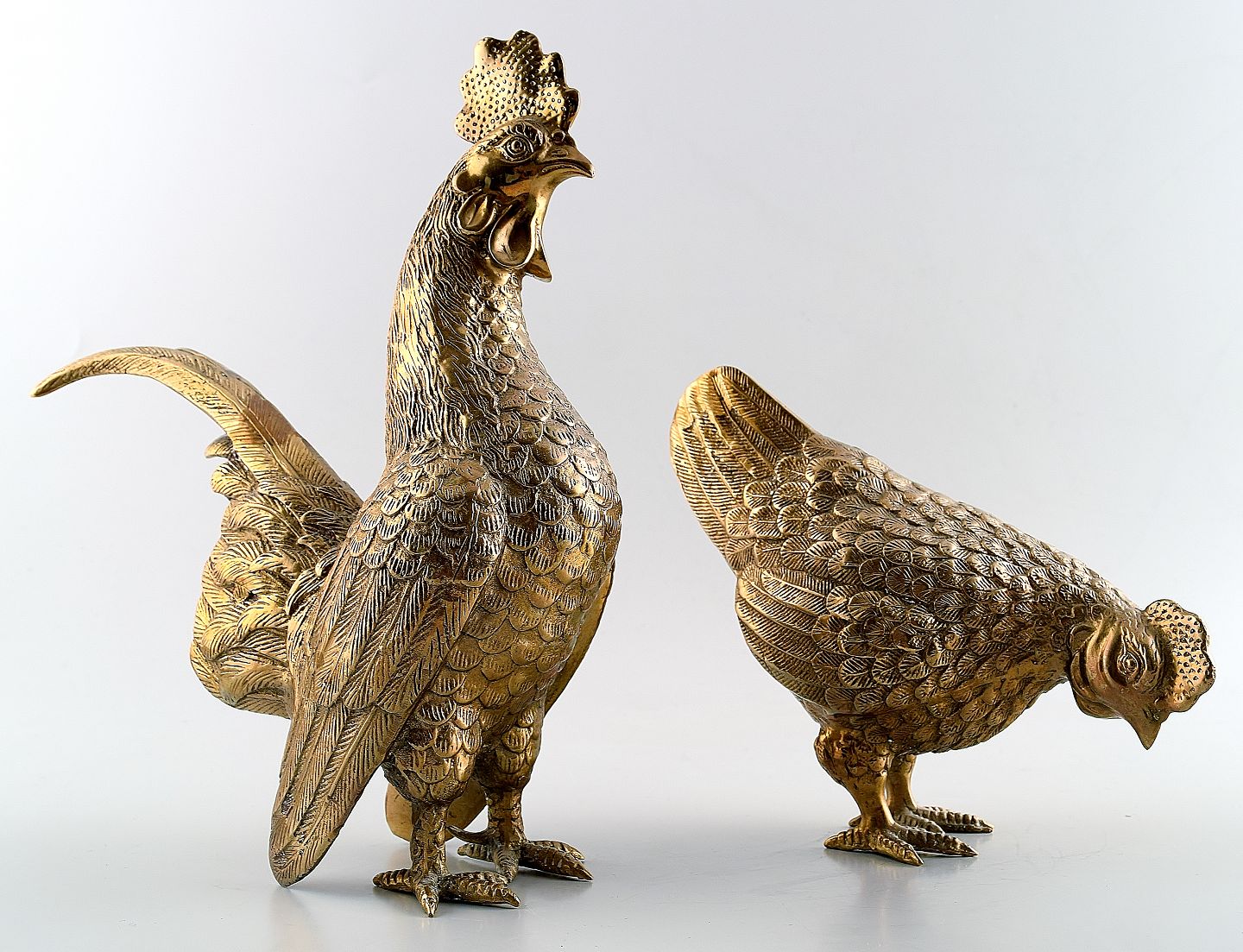 2 messing bordpynt/prydgenstande i form af en hane og en høne. Hane måler 26 x 19 cm. I god stand.