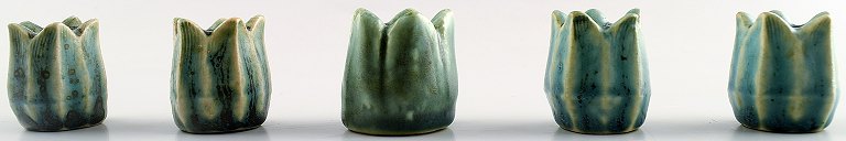 Eva Stæhr-Nielsen, Saxbo, 5 candlesticks, art pottery. Stamped: E. St. N. glaze in shades of green. Measures 3.3 cm. In perfect condition.