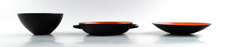 Krenit skål og to fade af Herbert Krenchel. Sort metal og orange emalje. 1970'erne. Skålen måler 12.5 cm. i diameter. 6,5 cm. høj. Fadene måler 16 cm. og 18.5 cm. I god stand. Stemplet . Krenit, Denmark.