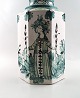 En stor bordlampe af lertøj, modelleret i kantet form. Dekoreret med grøn og sort glaserede motiver på lysegrå base.