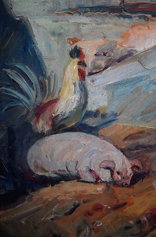 Ubekendt skandinavisk kunstner, ca. 1920. Olie på plade. Grisestald. 72 x 60 cm. Total størrelse inkl. ramme (82 x 70 cm.) Usigneret. På bagsiden "Aug. Berg" svensk kunstner. I perfekt stand.