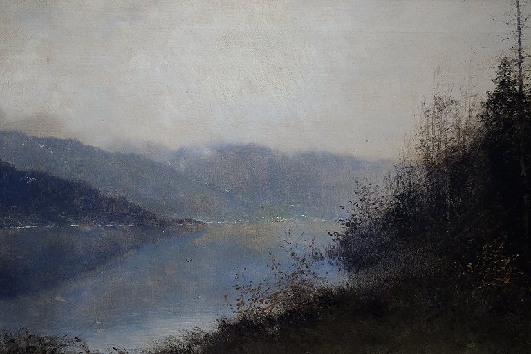 Tågelandskab af Ludvig Skramstad (1855-1912) svensk kunstner. Olie på lærred, signeret. Måler 42 x 69 cm. (63 x 90 cm.) I perfekt stand.