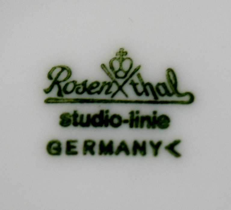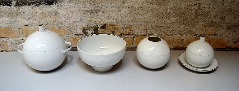 Rosenthal studio line Bjørn Wiinblad. 12 personers "Lotus" med sølvkant, komplet middagsservice i moderne design, bestående af 12 middagstallerkener, 12 frokosttallerkener, 12 dybe tallerkener, terrin, 3 fade, skål, sovsekande, vase, i alt 43 dele.