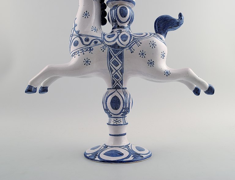 Bjørn Wiinblad stor keramikfigur fra det blå hus. Figur / lysestage rytter til hest med plads til tre lys. Dekorationsnummer L5. Denne er fra 1977. Højde 42 cm., længde 30 cm. Perfekt stand.