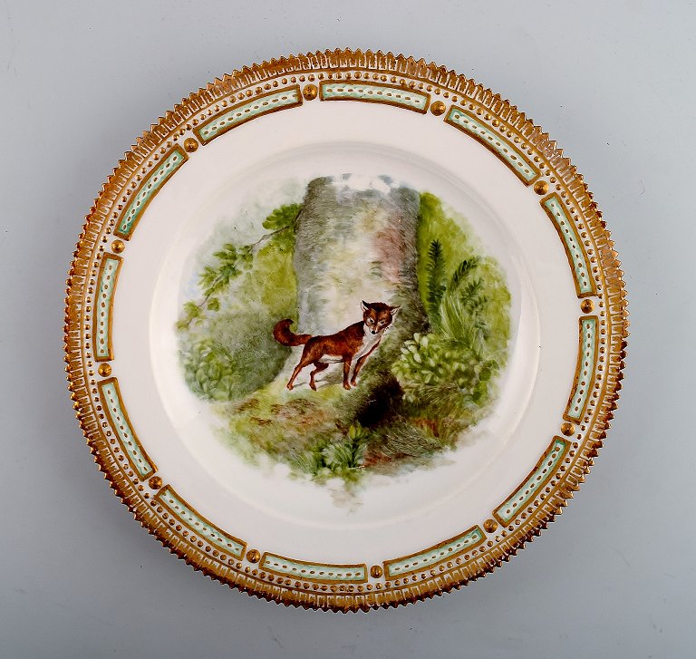 Royal Copenhagen flora Danica/fauna danica middagstallerken med motiv af ræv i skov. Malet i 1932. 25 cm. i diameter. Latinsk betegnelse : Canis Vulnes. 2. sortering, i perfekt stand.