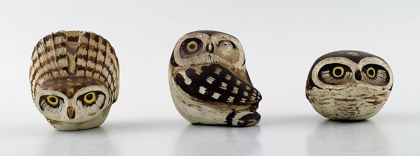 Gustavsberg studiohand, Edvard Lindahl, 3 ugler i keramik. Måler : 6,5 cm. x 6 cm. (største) I perfekt stand. Stemplet.