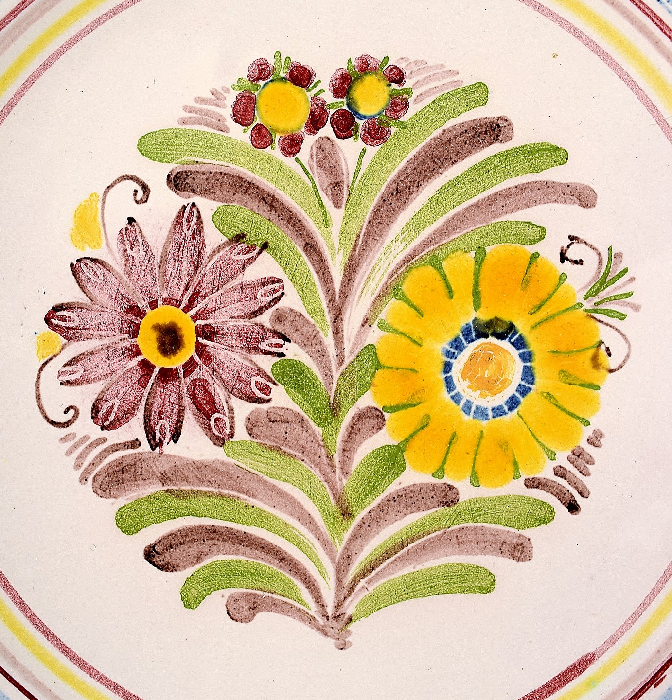 Tulle Emborg for Kähler, HAK, glaseret stentøjsfad dekoreret med blomster. Flot polykrom glasur. Ca. 1940´erne. Stemplet. Mål: 22,5 cm. I perfekt stand.