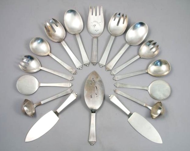 DENMARK. Georg JENSEN. Cutlery in silver, 184 pieces. Model "Pyramid" created in 1933-34 by Harald NIELSEN for Georg Jensen. 12 place dinner setting (large version) : 12 large dinner knives (stainless steel blade), 12 dinner forks and 12 table spoons.