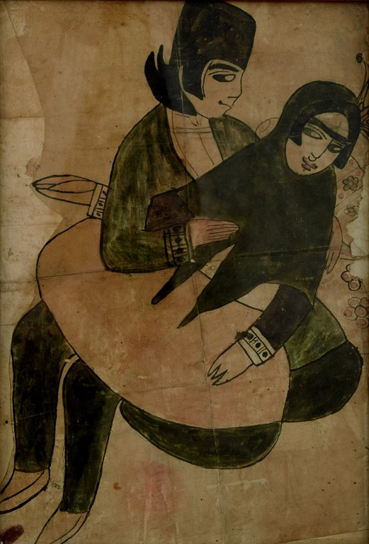 Erotisk scene, akvarel på papir sat på plade. Persisk/Iransk skole, ubekendt kunstner.