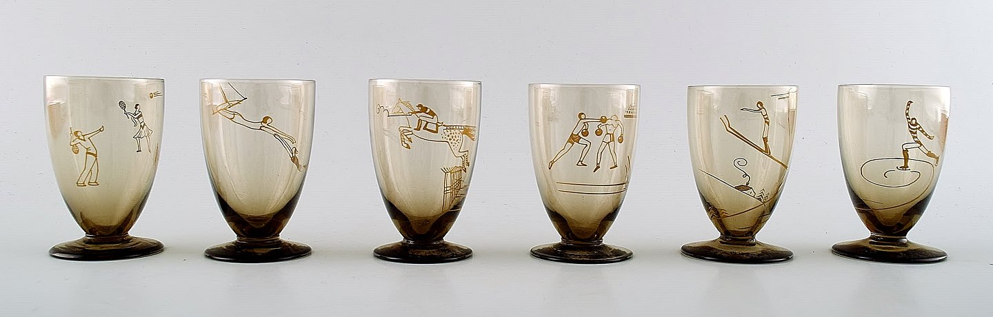 Daum, Nancy, Art deco barsæt, karaffel samt 11 glas på bakke. Dekoreret med sportsmotiver. Karaflen måler 24 cm. x 11 cm. Bakken 30 cm. i diameter. Stemplet. I perfekt stand.