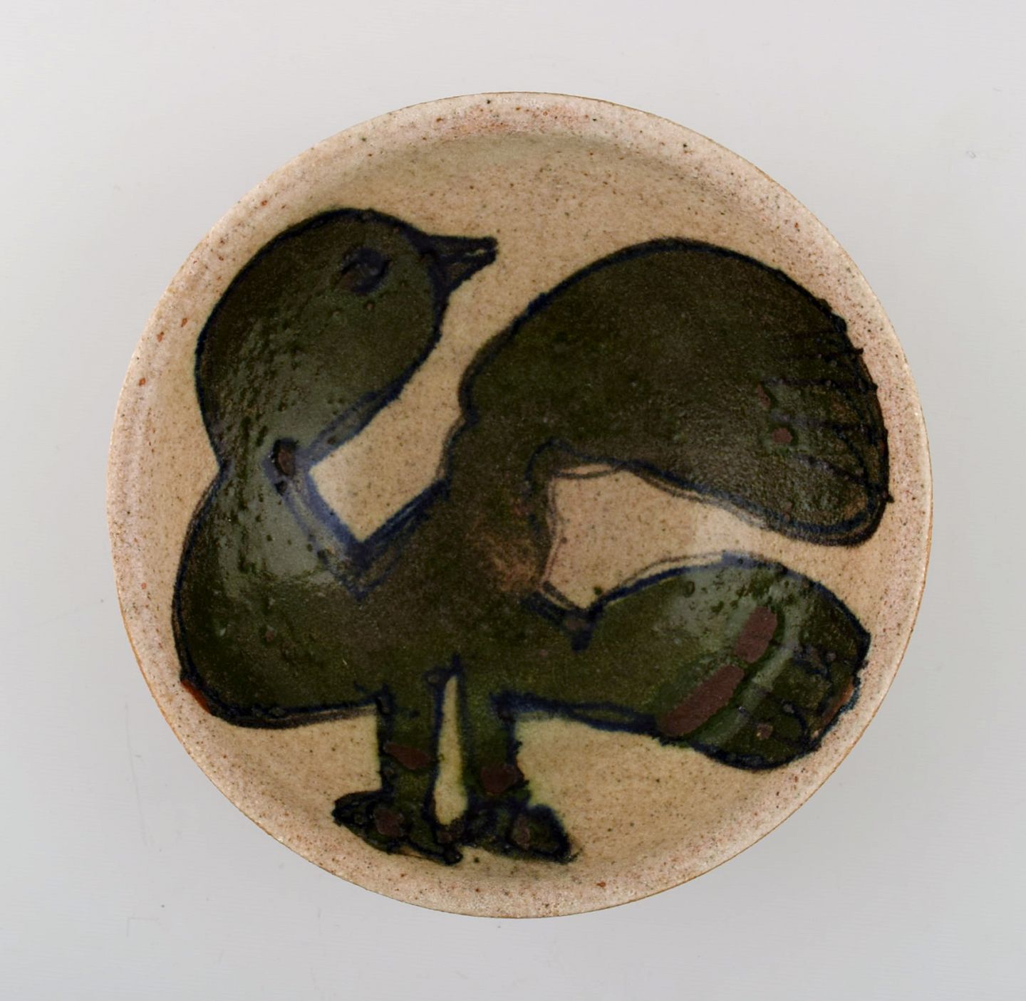 Unique ceramic bowl by Sten Lykke Madsen, own workshop. Decorated with a bird. Signed: Sten. Measures 19 cm. X 6 cm. In very good condition.