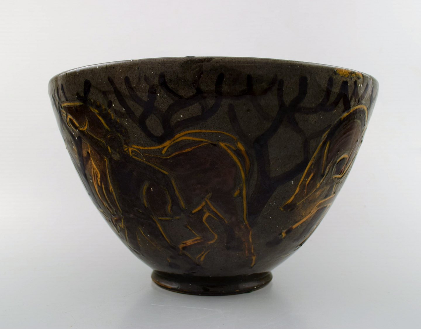 Unika Helge Daner Jensen for Kähler. Keramikskål dekoreret med mænd og heste, ca. 1920´erne.