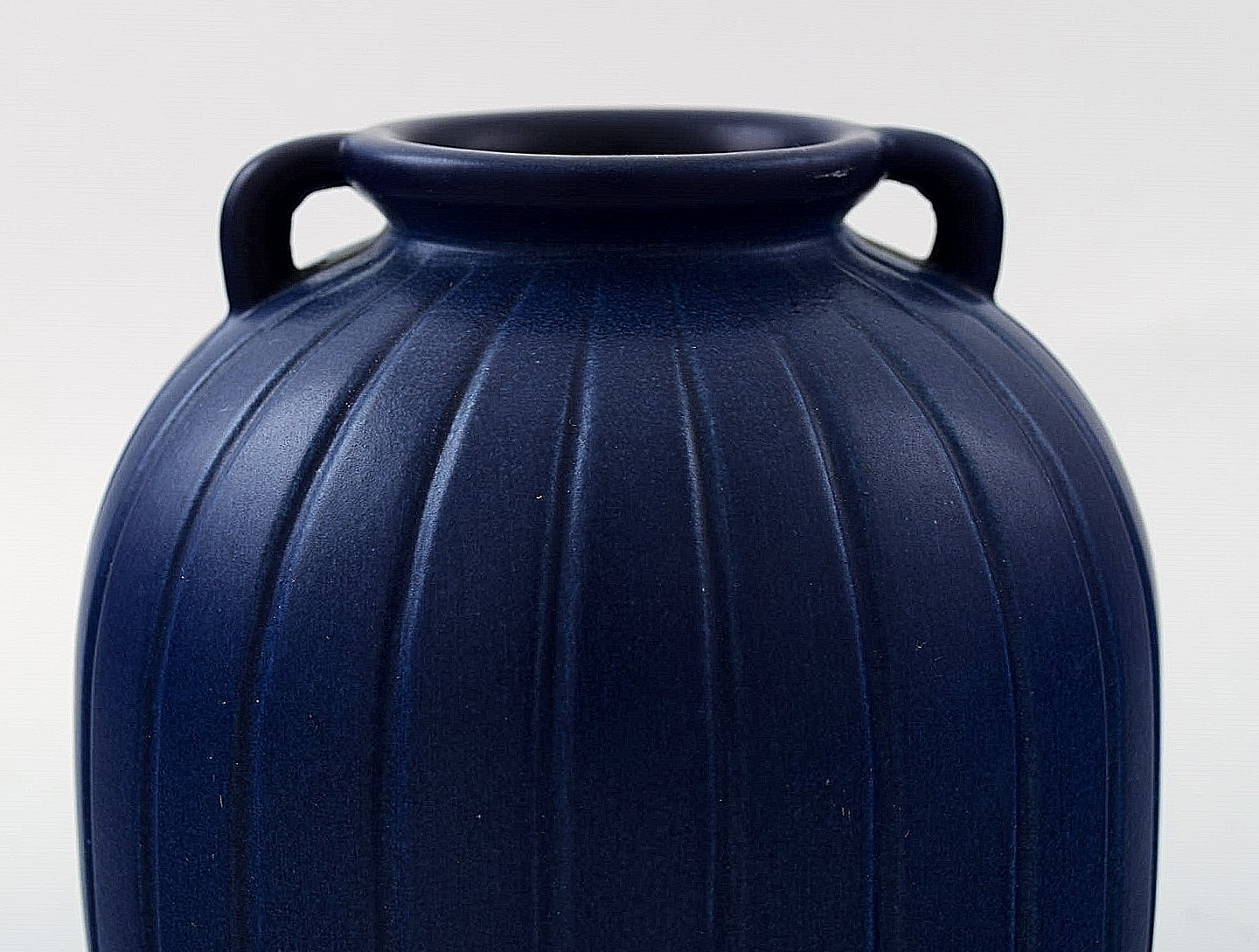 Ipsens enke modelnummer 14, keramikvase med rillet korpus. Smuk mørkeblå glasur. Måler : 14 cm. x 12 cm. I perfekt stand. Stemplet.