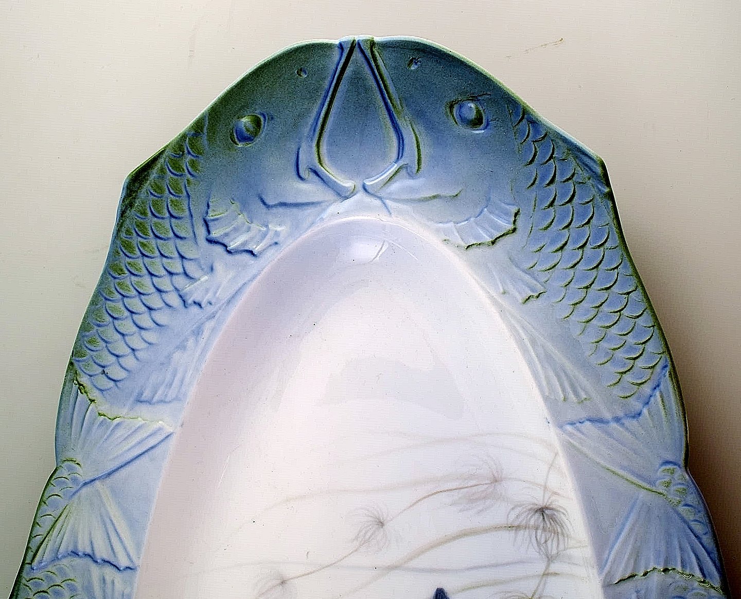 Arnold Krog for Royal Copenhagen : "Fiskestel" af porcelæn, meget stort ovalt fiskefad dekoreret i farver med fisk. Nummer 999/3001. Måler : 60 cm. x 27 cm. 2. sortering, i perfekt stand.