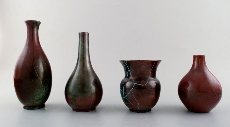 Richard Uhlemeyer, tysk keramiker. Fire keramikvaser, smuk glasur i rødgrønne nuancer. Tyskland, 1940´erne. Største måler 20,5 cm. x 9 cm. I perfekt stand. Stemplet.