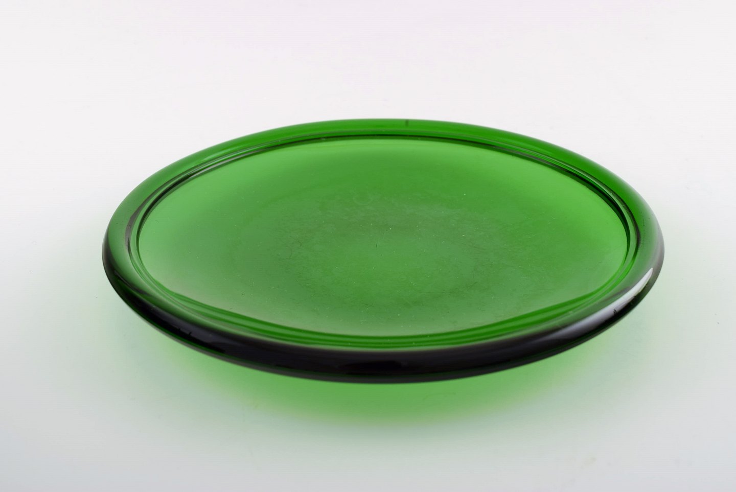 6+6 tallerkener/assietter i grønt kunstglas, Josef Frank. Firma : Reijmyre/Gullaskruf. I flot stand. Måler : 19 og 16 cm.