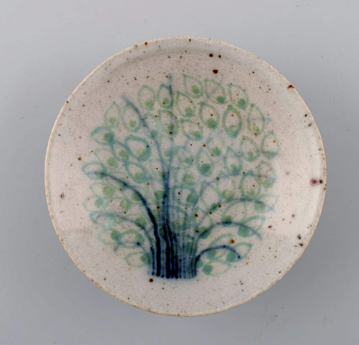 Snorre Stephensen: Lille skål af stentøj dekoreret med træ i blå og grøn glasur samt med transparent overglasur.