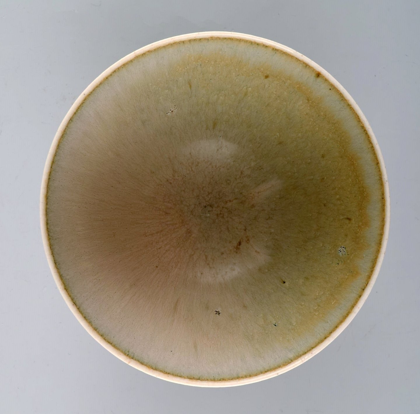 Saxbo skål af stentøj dekoreret med smuk æggeskalsglasur. Stemplet Saxbo. Måler 12 cm. x 6,5 cm. I perfekt stand.