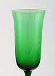 SIMON GATE for Orrefors, Et sæt på 12 grønne champagneglas i kunstglas.. Designer: Simon Gate Serie: Salut Producer: Orrefors Land: Sverige Designet: 1923 Størrelse: Højde 19 cm, diameter 6 cm.