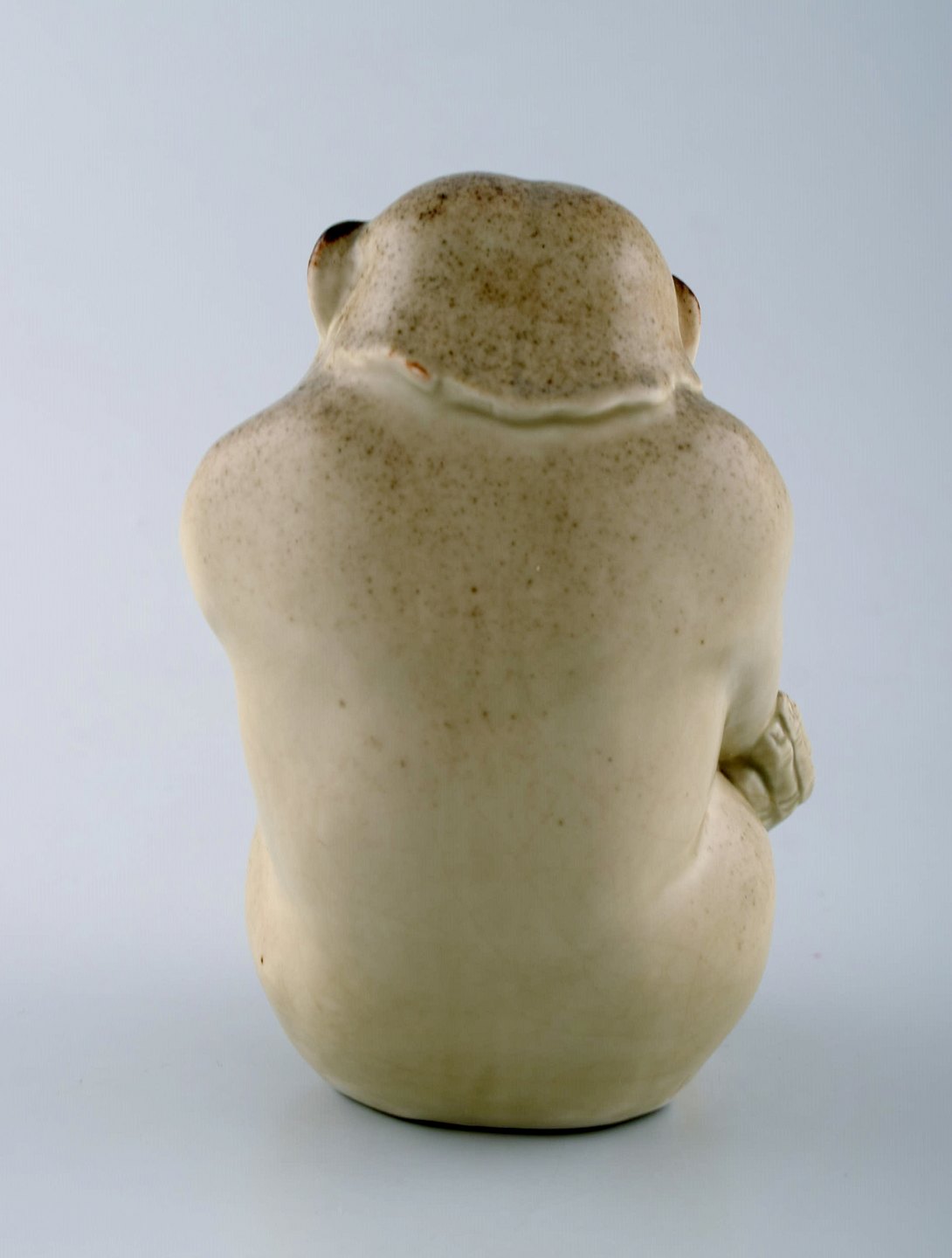 Sjælden Knud Kyhn for Aluminia/Royal Copenhagen, stentøjsfigur, abe. Lys krakkeleret glasur. 1. sortering. Perfekt stand. 1920/30´erne. Måler 14 cm. x 7,5 cm. Stemplet : Kyhn på siden samt Aluminia 57102.