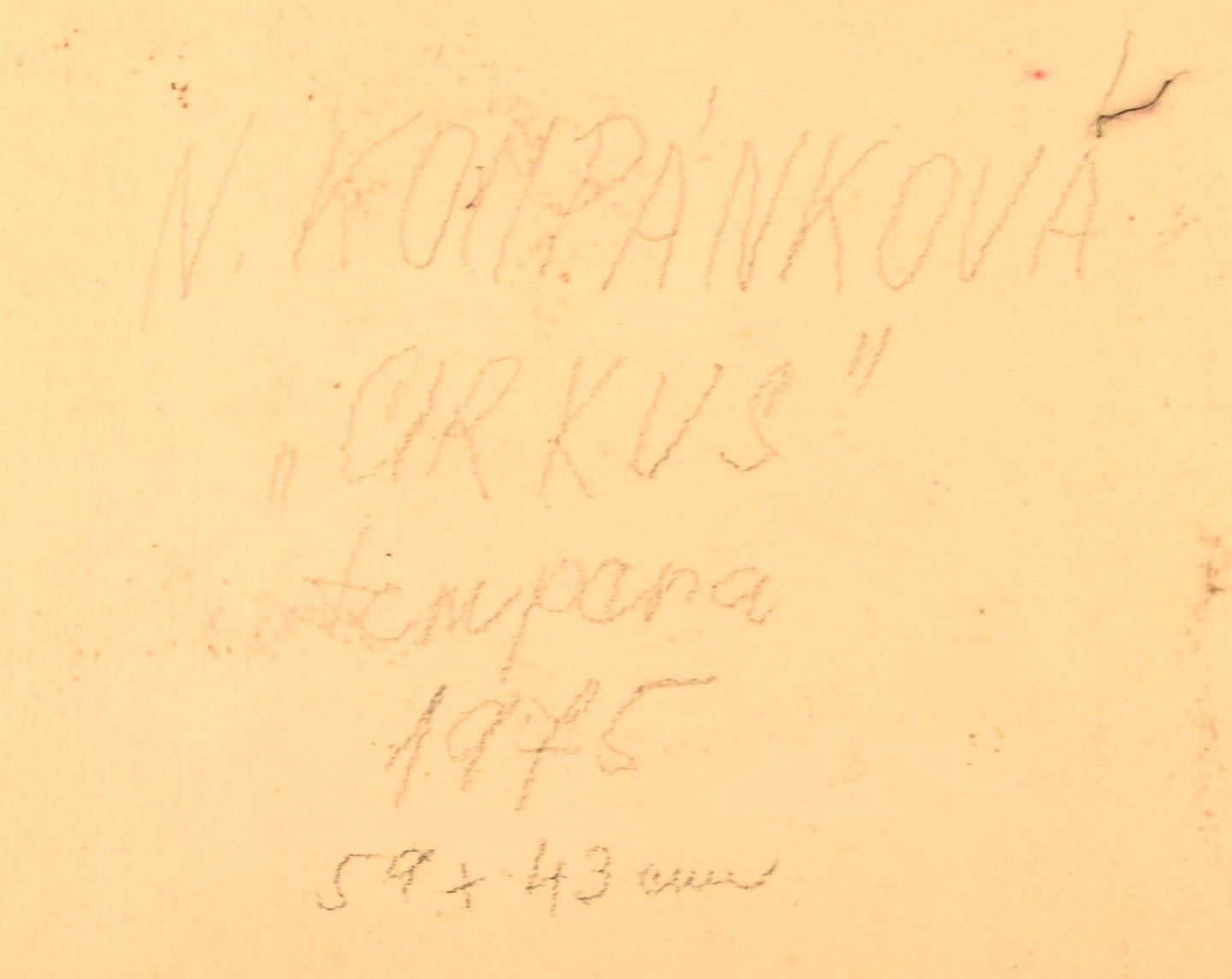 Natalie Kompánková (1900-tallet, Rusland). Gouache pċ papir. Naivistisk sceneri med cirkusartister. "Cirkus". 1974. I flot stand. Mċler: 42 x 59 cm Signeret og dateret.