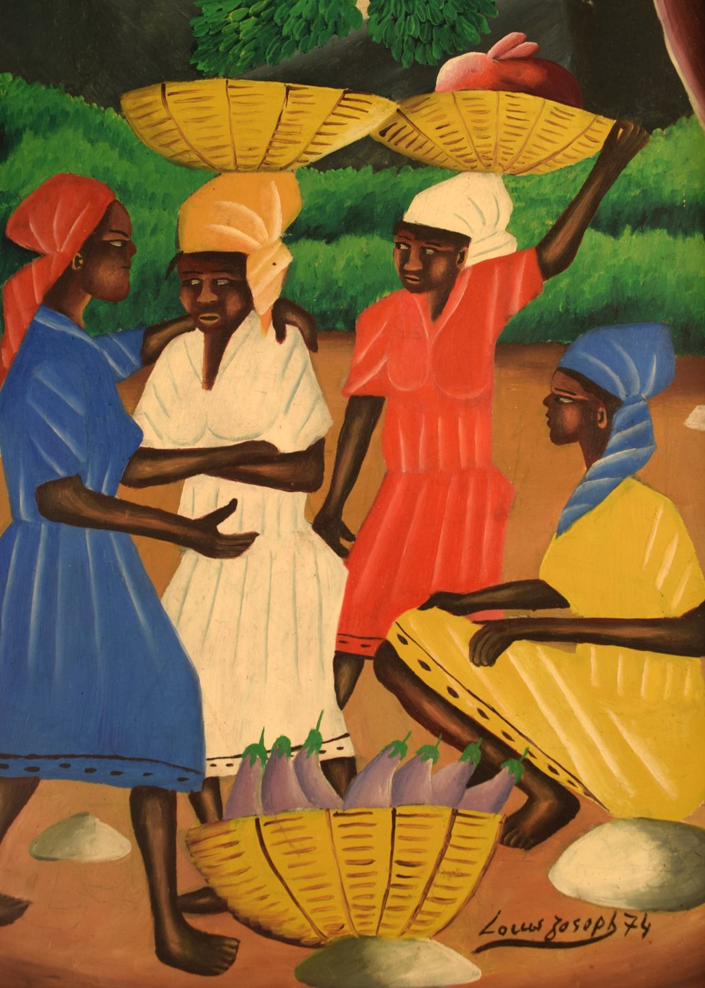 Loccas Joseph, haitiansk kunstner. Naivistisk skole. Olie på plade. 1974. Landsbykvinder bærende på frugter. Signeret. I flot stand. Lærredet måler: 59 x 29 cm. Rammen måler: 2 cm.