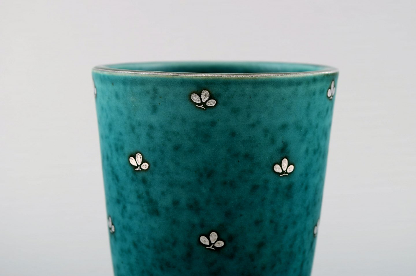 Wilhelm Kåge, Gustavsberg, Argenta Art deco keramikvase dekoreret med blade. Sverige 1940´erne. Måler 13 x 10 cm. Stemplet Gustavsberg, Kåge. I perfekt stand.