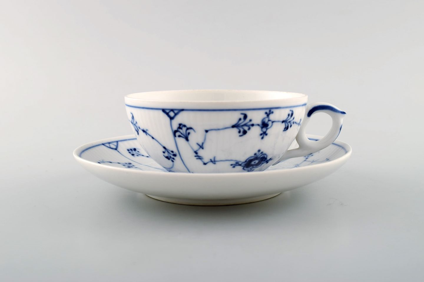 Royal Copenhagen Musselmalet riflet thekop med underkop # 1/76. 2 sæt på lager. I perfekt stand. 1. sortering. Stemplet. Kop diameter: 9,2 cm. Underkop diameter: 15 cm.