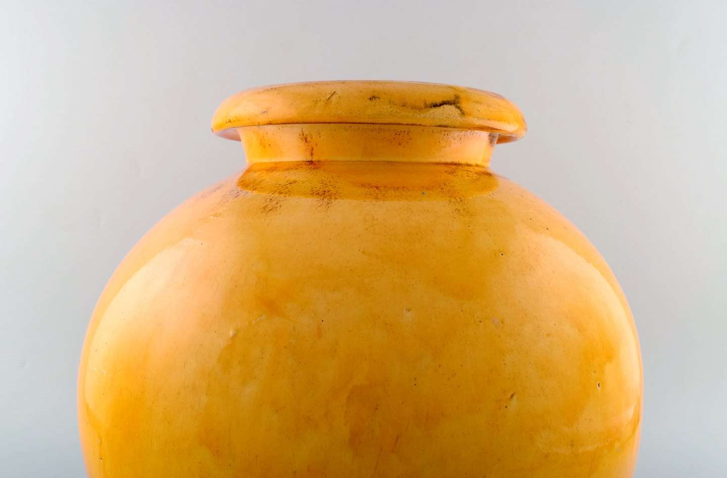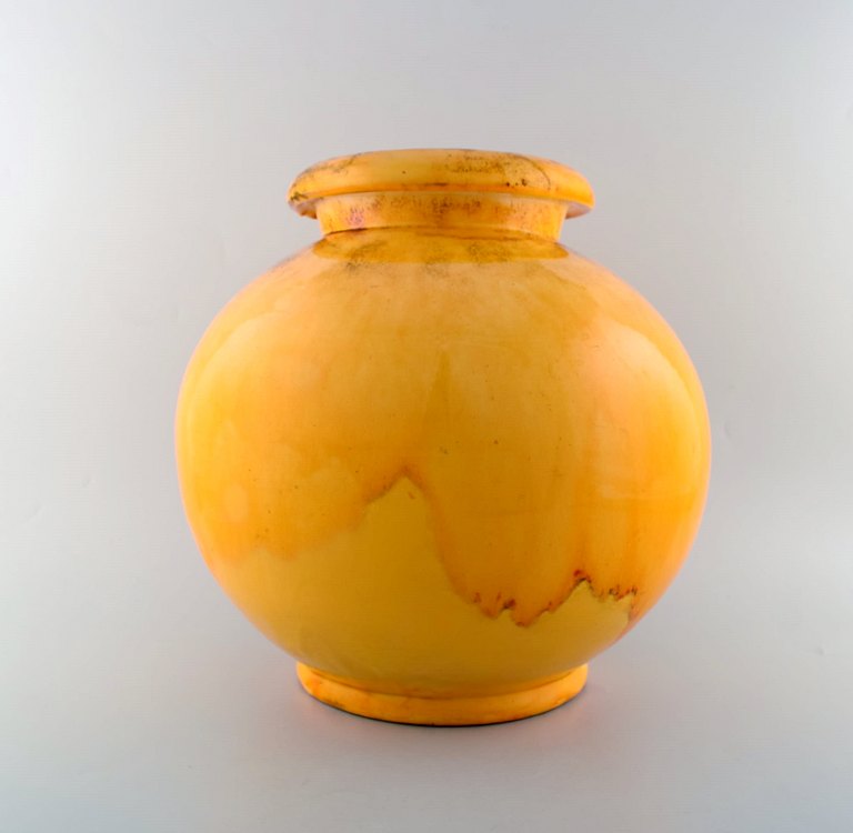 Stor Kähler, HAK, Svend Hammershøi, glaseret gulvvase i stentøj. kuglerund form. I perfekt stand. Flot urangul glasur. Stemplet. Måler: 34 cm x 34 cm.