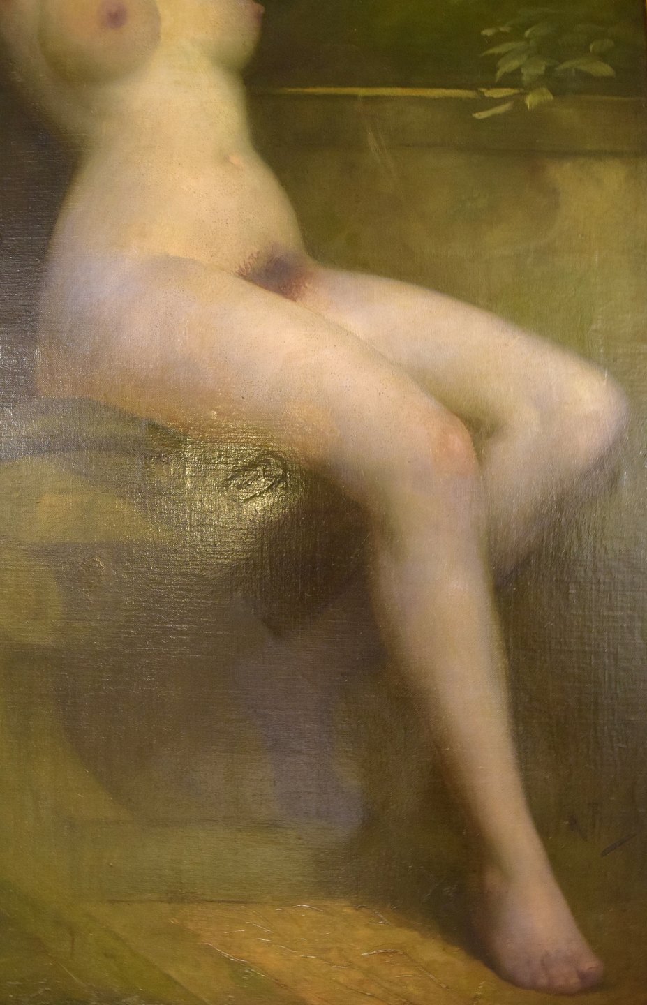 Rudolf Preuss, Austrian painter (b.1879, 1961). Oil on canvas. Seated young nude model. Dated 1899.