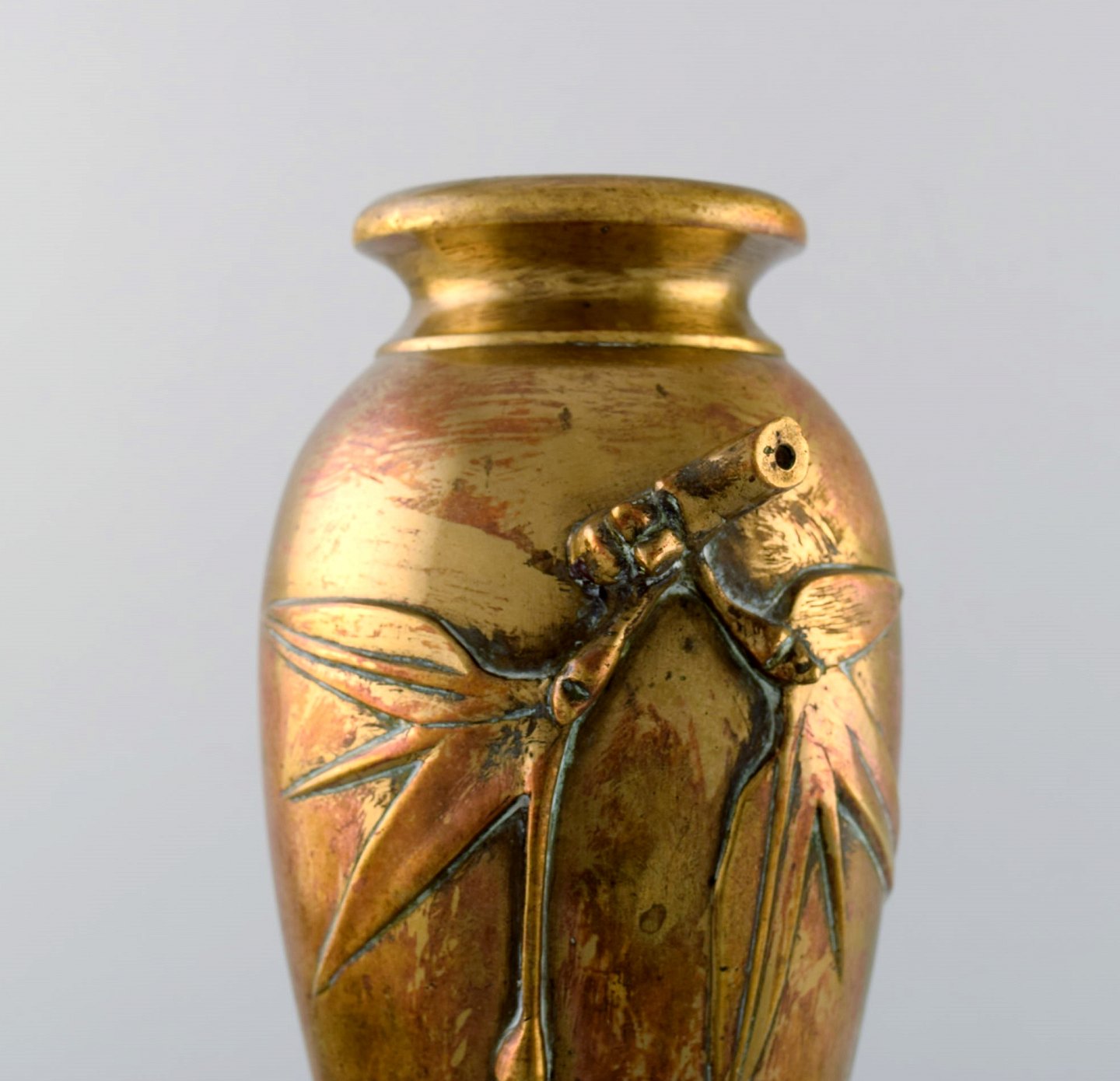 Et par franske art nouveau bronzevaser med blomster i relief. Ca. 1890. I flot stand. Måler: 29,5 x 12,5 cm.