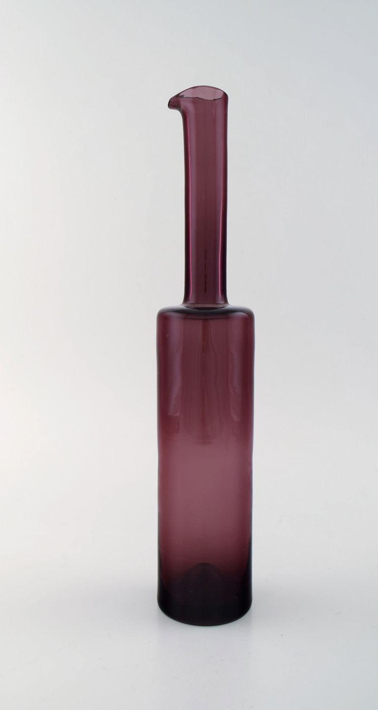 Nanny Still for Riihimäen Lasi, finsk glaskunst dekorationsflaske, vase/kande. I perfekt stand. Smuk lilla farve. 1960/70´erne. Måler: 33,5 x 6 cm.