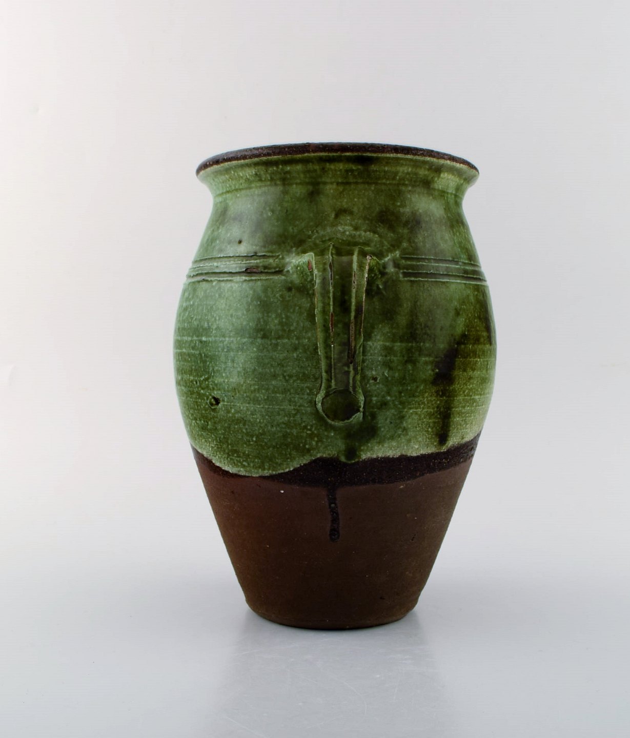 Gutte Eriksen: f. Rødby 1918, d. 2008. Stor unik vase af stentøj. modelleret med hanke, dekoreret med glasur i grønne nuancer. Måler : 25 x 24 cm. Signeret. I flot stand.